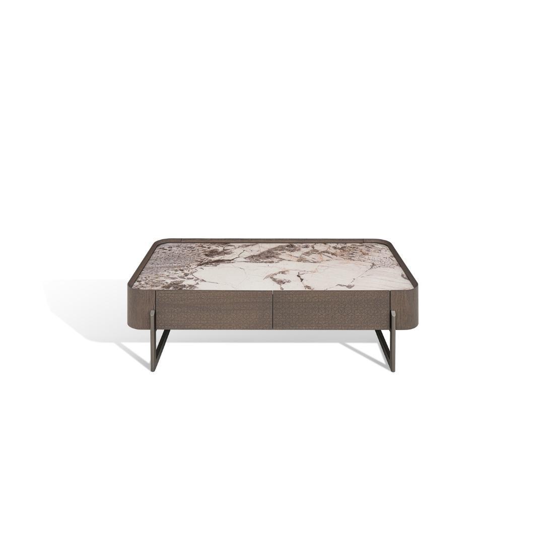 A modern coffee table with a glass top and grey oak veneer, featuring a spacious rectangular shape and rounded corners. Hidden drawers and rim detail keep your space tidy and functional.