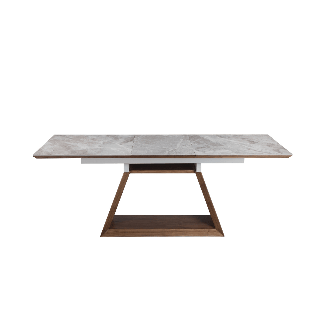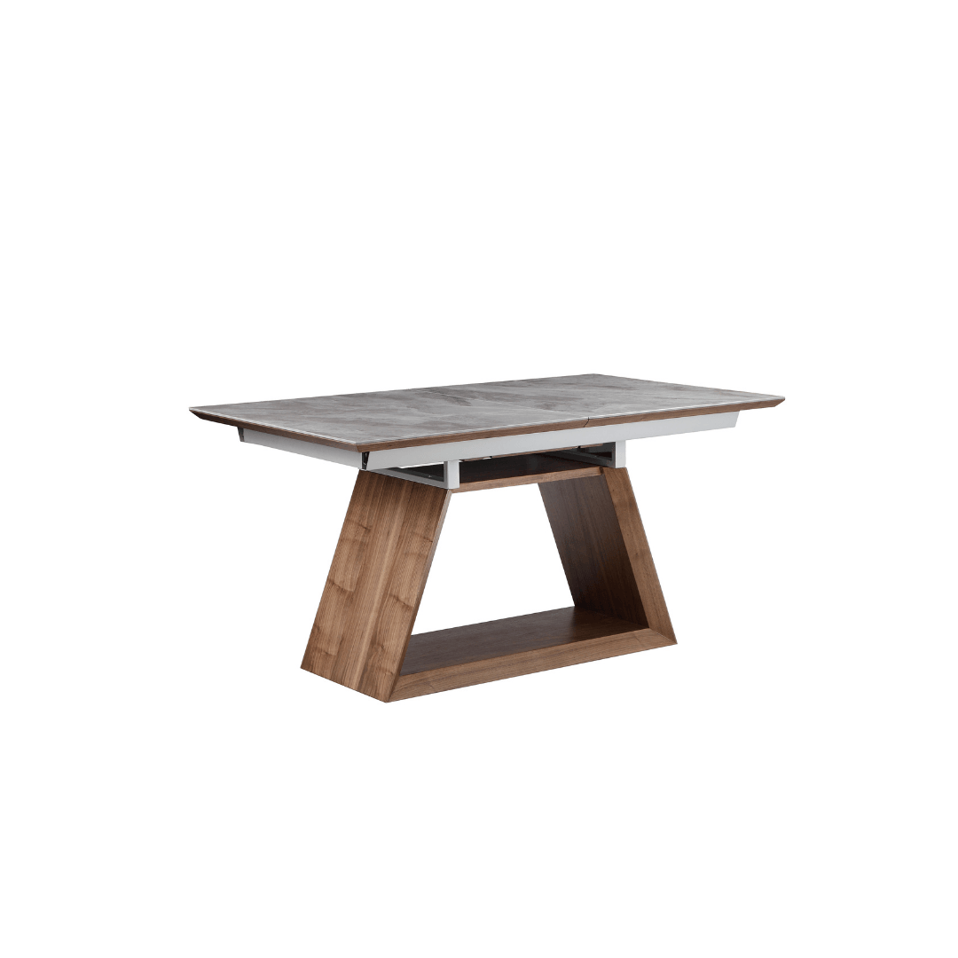 The Dublin Dining Table boasts a grey ceramic top and walnut veneer, with a unique angled base design. Extendable to accommodate more guests, it’s perfect for hosting or family meals.